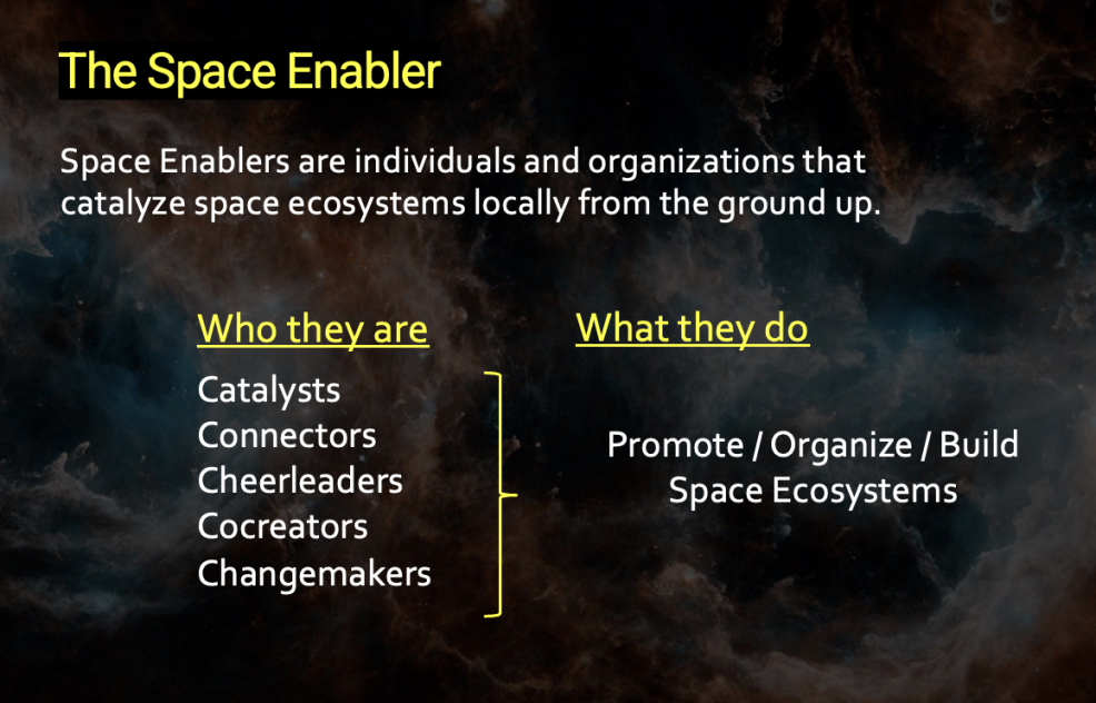 Connecting Enablers — Bringing together global space ecosystem builders to connect, learn, and support each other to gather best practices and toolkits through communication and resource platforms, events, convening meetings, peer consultations, and other network activities.